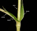 Each leaf has a thin, wide stipule which forms a fringed, fibrous ochrea around the base of the leaf.