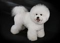 The bichon has a curly, white coat.