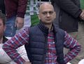 John đứng với tay chống nạnh.