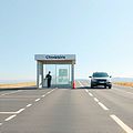 Travelers must stop at an inspection checkpoint at the border crossing.