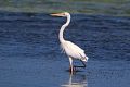 The great white heron stood motionless in the shallow water.