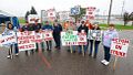Những công nhân bãi công tập trung trước cổng nhà máy, giương cao các biểu ngữ và hô khẩu hiệu.