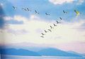 That flock of birds is flying north.