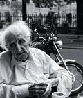 The decrepit old man struggled to climb the stairs.