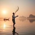 She scattered rice grains to feed the chickens.