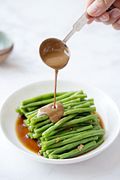 (Anh ấy rưới một nhúm muối lên salad.)