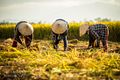 Farmers harvest rice during the dry season.